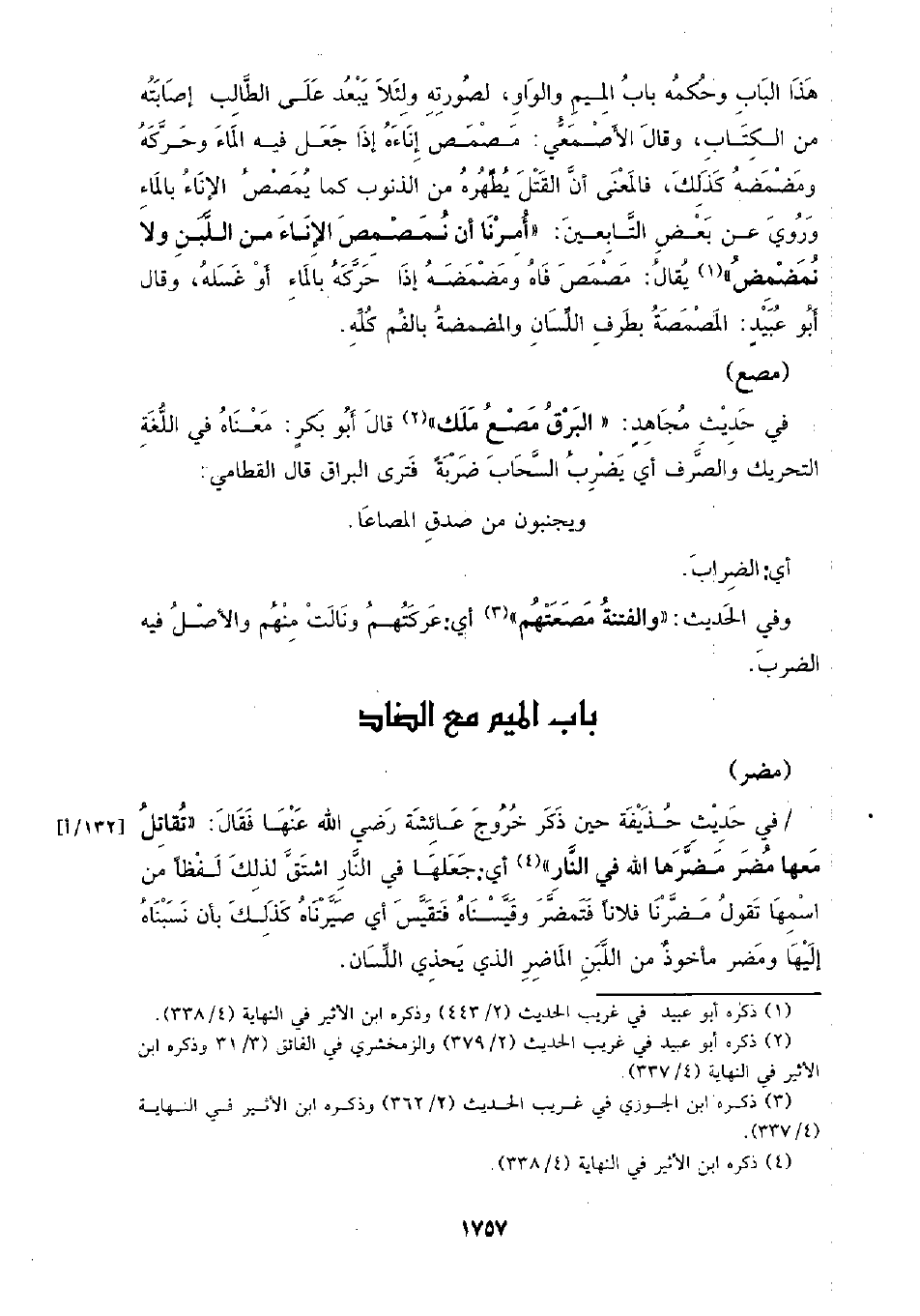 في حديث مجاهد: (البرق مصع ملك) قال أبو بكر: معناه في اللغة التحريك والصرف أي يضرب السحاب ضربة فترى البراق قال القطامي: