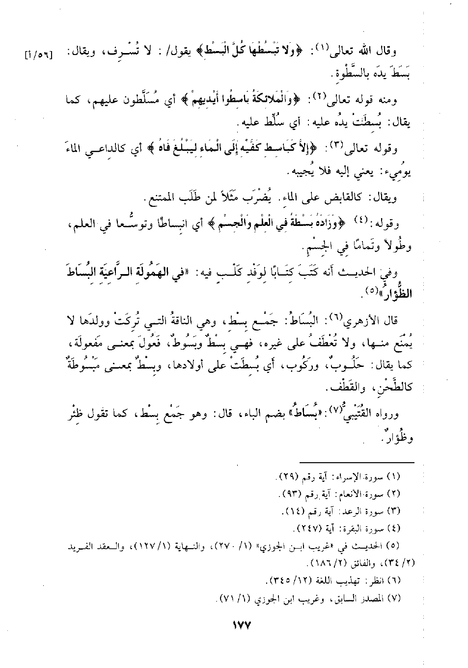 ورواه القتيبي: (بساط) بضم الباء، قال: وهو جمع بسط، كما تقول ظئر وظؤار.