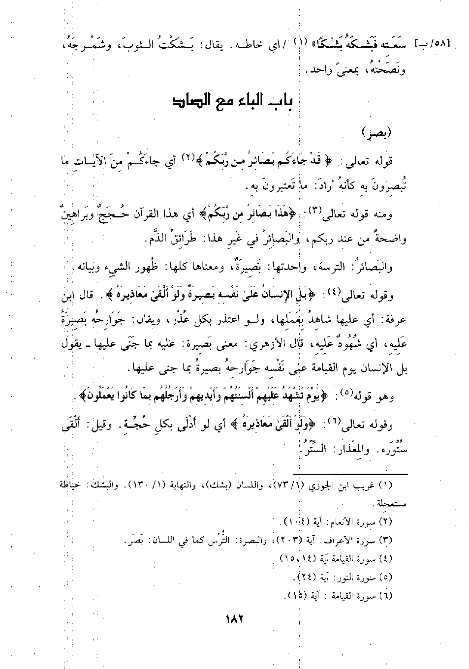 ومنه قوله تعالى: {هذا بصائر من ربكم} أي هذا القرآن حجج وبراهين واضحة من عند ربكم، والبصائر في غير هذا: طرائق الذم.