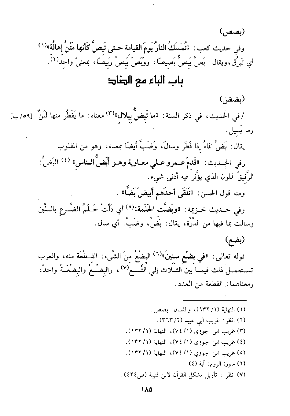 وفي حديث كعب: (تمسك النار يوم القيامة حتى تبص كأنها متن إهالة) أي تبرق، ويقال: بص يبص بصيصًا، ووبص يبص وبيصًا، بمعنى واحد.