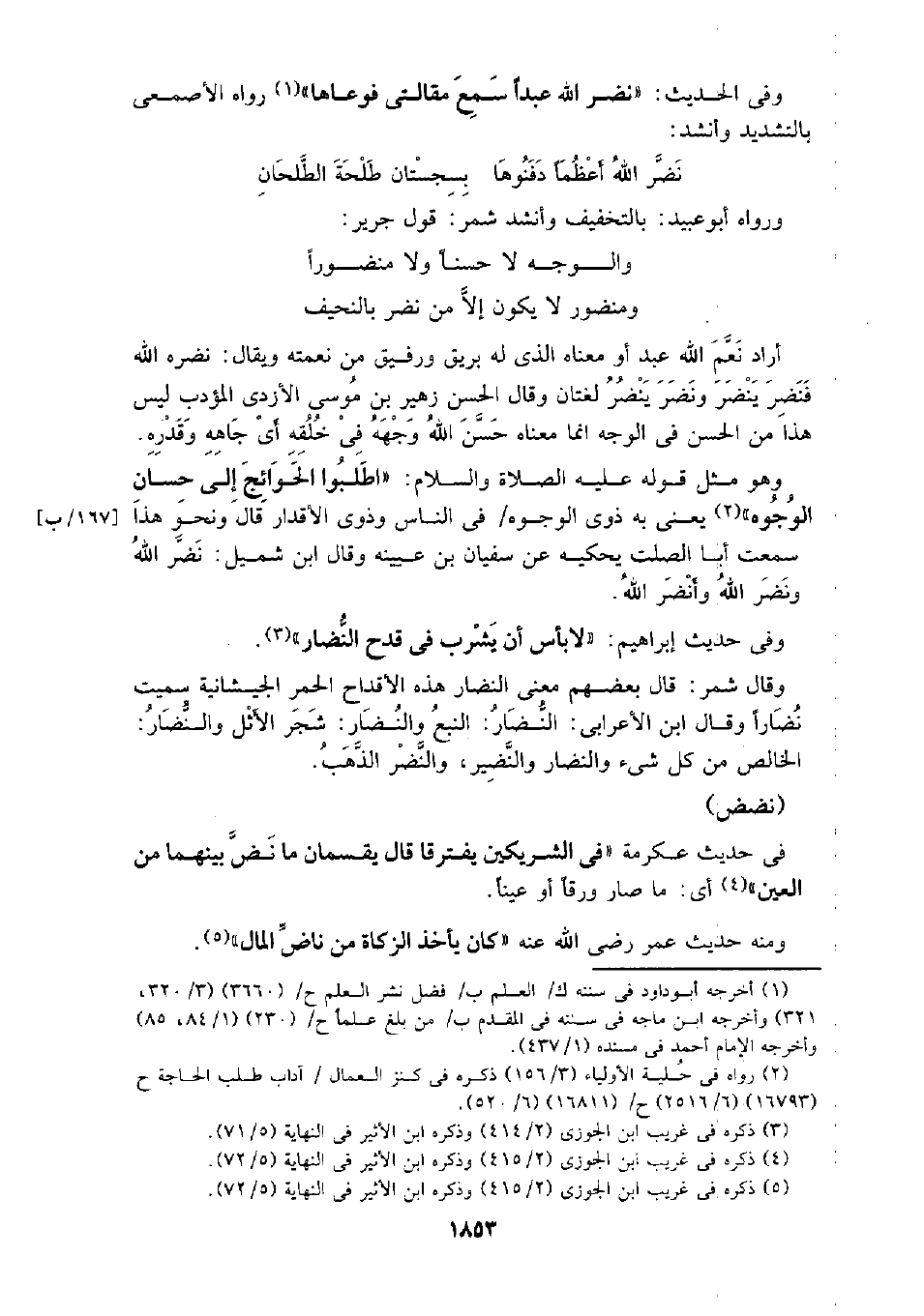 وهو مثل قوله عليه الصلاة والسلام: (اطلبوا الحوائج إلى حسان الوجوه) يعني به ذوي الوجوه/ في الناس وذوي الأقدار قال ونحو هذا سمعت أبا الصلت يحكيه عن سفيان بن عيينه وقال ابن شميل: نضر اله ونضر الله وأنضر الله.