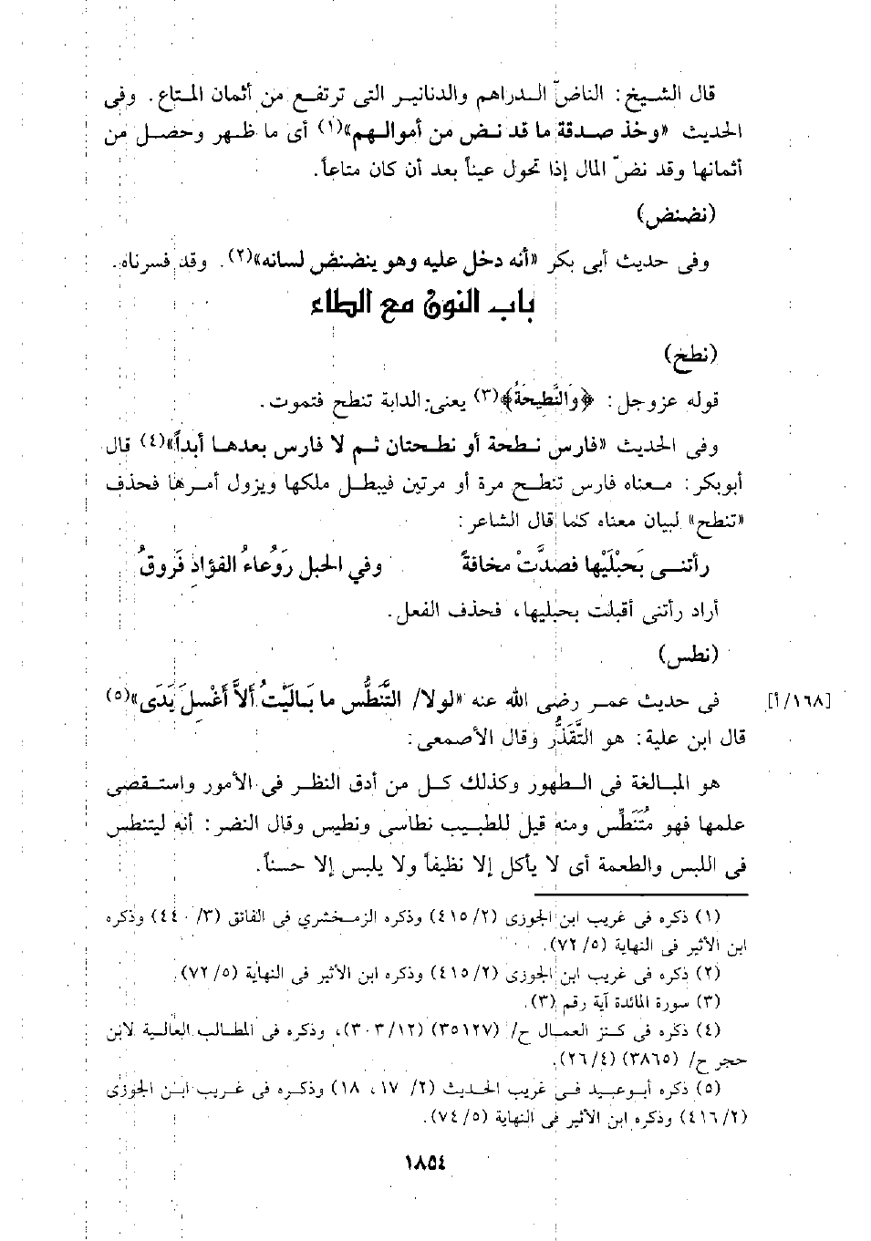 هو المبالغة في الطهور وكذلك كل من أدق النظر في الأمور واستقصى علمها فهو متنطس ومنه قيل للطبيب نطاسي ونطيس وقال النضر: أنه ليتنطس في اللبس والطعمة أي لا يأكل إلا نظيفًا ولا يلبس إلا حسنًا.