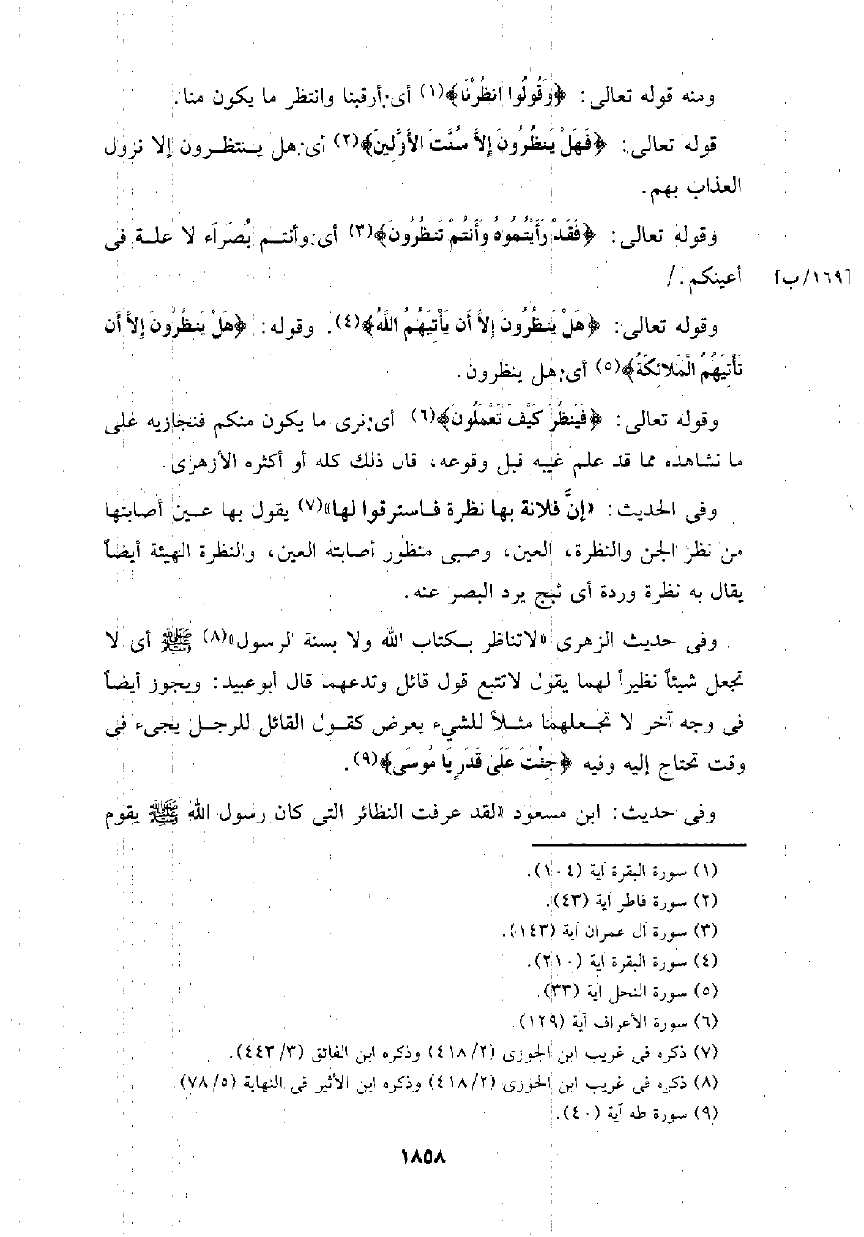 وفي حديث الزهري (لا تناظر بكتاب الله ولا بسنة الرسول) - صلى الله عليه وسلم - أي لا تجعل شيئًا نظيرًا لهما يقول لا تتبع قول قائل وتدعهما قال أبو عبيد: ويجوز أيضًا في وجه آخر لا تجعلهما مثلًا للشيء يعرض كقول القائل للرجل يجئ في وقت تحتاج إليه وفيه} جئت على قدر يا موسى}.