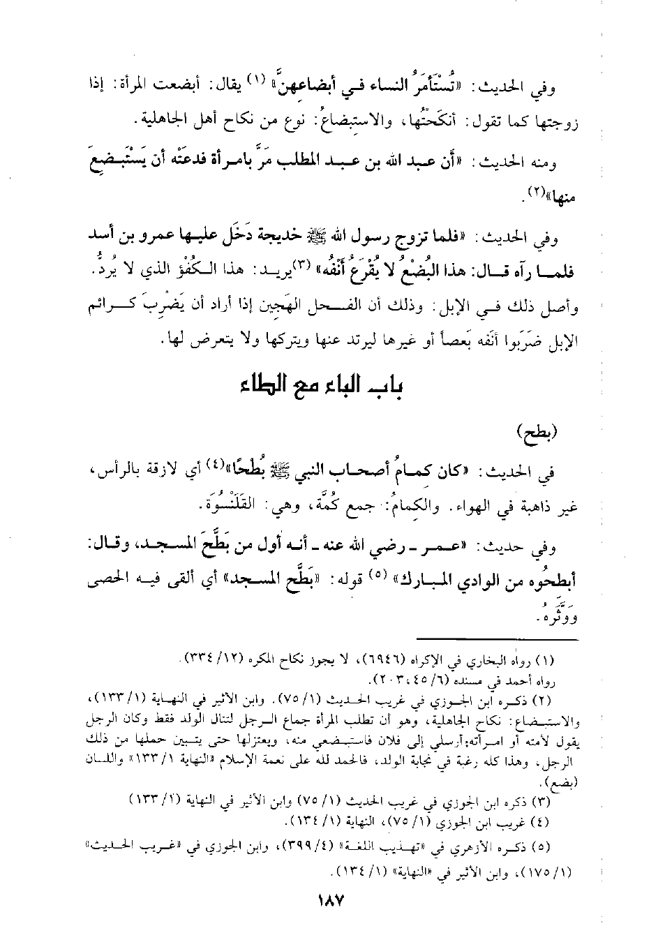 وفي حديث: (عمر- رضي الله عنه- أنه أول من بطح المسجد، وقال: أبطحوه من الوادي المبارك) قوله: (بطح المسجد) أي ألقى فيه الحصى ووثره.