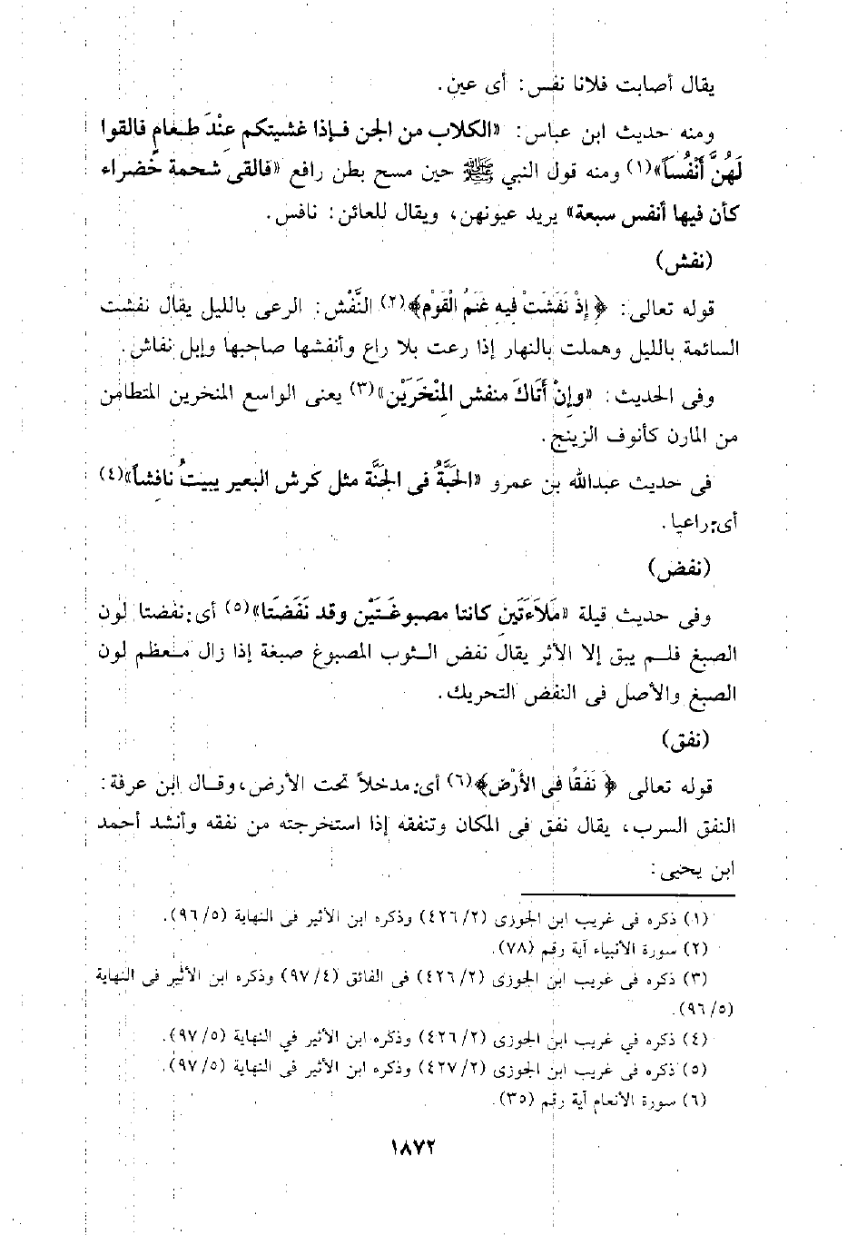 ومنه حديث ابن عباس: (الكلاب من الجن فإذا غشيتكم عند طعام فالقوا لهن أنفسا) ومنه قول النبي - صلى الله عليه وسلم - حين مسح بطن رافع (فالقى شحمة خضراء كأن فيها أنفس سبعة) يريد عيونهن، ويقال للعائ: نافس.