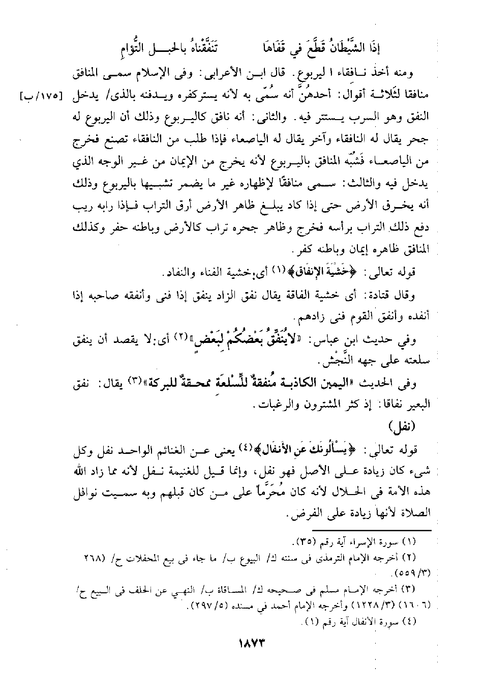 ومنه أخذ نافقاء اليربوع. قال ابن الأعرابي: وفي الإسلام سمى المنافق منافقا لثلاثة أقوال: أحدهن أنه سمى به لأنه يستركفره ويدفنه بالذي يدخل النفق وهو السرب يستتر فيه. والثاني: أنه نافق كاليربوع وذلك أن اليربوع له جحر يقال له النافقاء وآخر يقال له الياصعاء فإذا طلب من النفافقاء تصنع فخرج من الياصعاء فشبه المنافق باليربوع لأنه يخرج من الإيمان من غير الوجه الذي يدخل فيه والثالث: سمى منافقًا لإظهاره غير ما يضمر تشبيها باليربوع وذلك أنه يخرق الأرض حتى إذا كاد يبلغ ظاهر الأرض أرق التراب فإذا رابه ريب دفع ذلك التراب يرأسه فخرج وظاهر جحره تراب كالأرض وباطنه حفر وكذلك المنافق ظاهره إيمان وباطنه كفر.