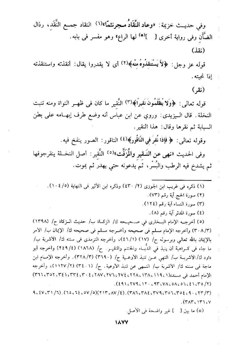 وفي الحديث (نهى عن النقير والمزقت) النقير: أصل النخلة ينقر جوفها ثم يشدخ فيه الرطب والبسر، ثم يدعونه حتى يهدر ثم يموت.