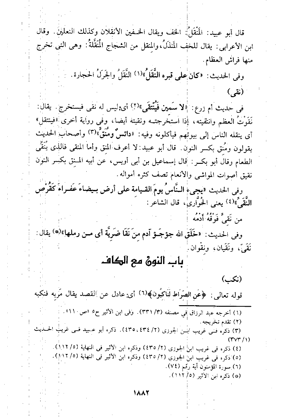 في حديث أم زرع: (لا سمين فينتقي) أي: ليس له نقى فيستخرج. يقال: نقوت العظم وانتقيته، إذا استخرجته ونقيته أيضا، وفي رواية أخرى (فينتقل) أي ينقله الناس إلى بيوتهم فيأكلونه وفيه: (دائس ومنق) وأصحاب الحديث يقولون ومنق بكسر النون. قال أبو عبيد: لا أعرف المنق وأما المنقى فالذي ينقي الطعام وقال أبو بكر: قال إسماعيل بن أبي أويس، عن أبيه المنق بكسر النون نقيق أصوات المواشي والأنعام تصف كثره أمواله.