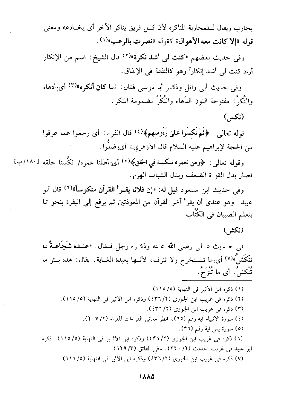 وفي حديث ابن مسعود قيل له: (إن فلانا يقرأ القرآن منكوسا) قال أبو عبيد: وهو عندي أن يقرأ القرآن من المعوذتي ثم يرفع إلى البقرة بنحو مما يتعلم الصبيان في الكتاب.