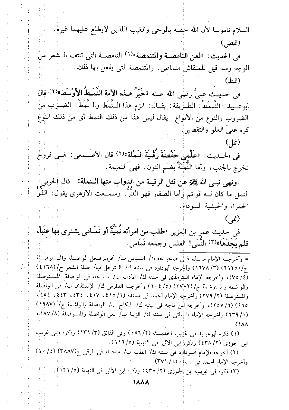 في الحديث: (علمي حفصة رقية النملة) قال الأصمعي: هي قروح تخلج بالجنب، واما النملة بضم النون: فهي النميمة.