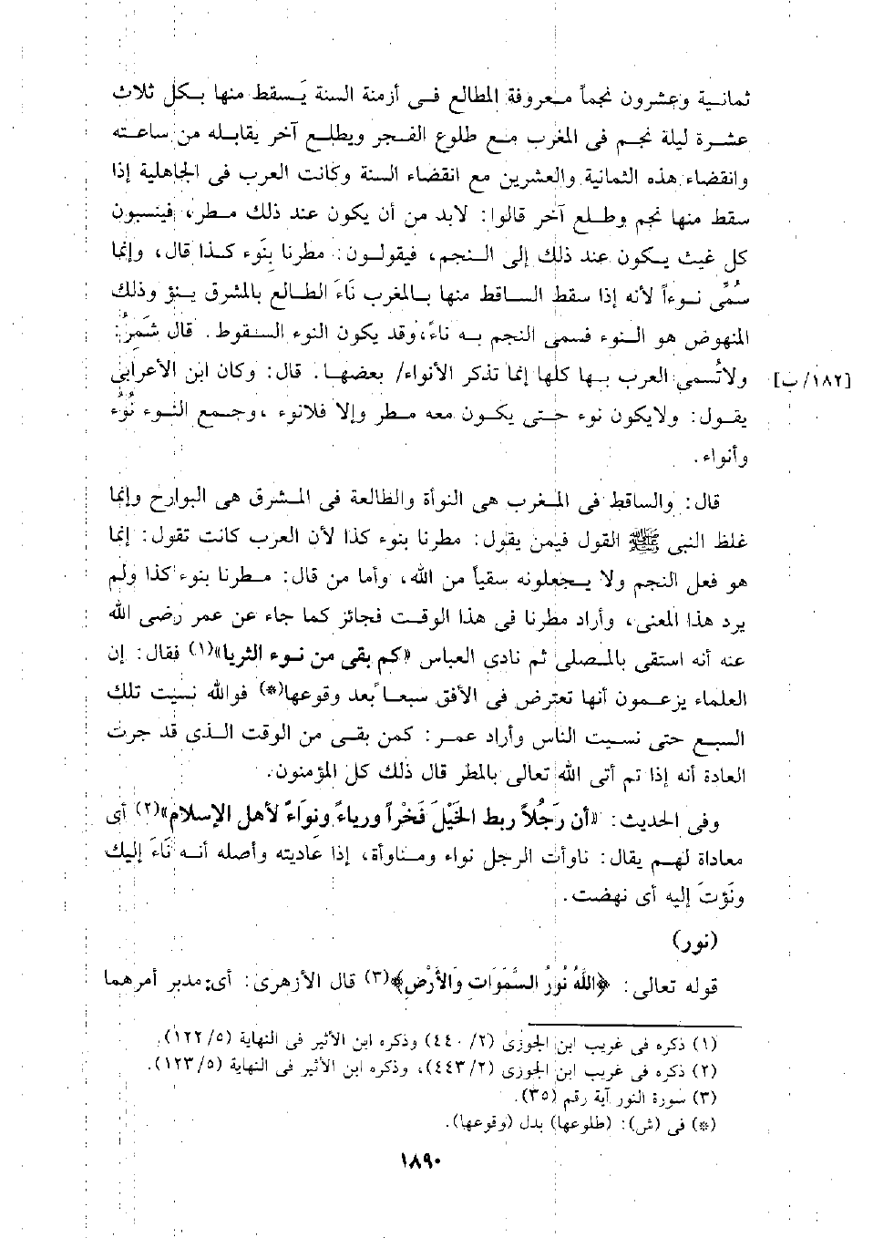 قال: والساقط في المغرب هي النوأة والطالعة في المشرق هي البوارح وإنما غلط النبي - صلى الله عليه وسلم - القول فيمن يقول: مطرنا بنوء كذا لأن العرب كانت تقول: إنما هو فعل النجم ولا يجعلونه سقيا من الله، وأما من قال: مطرنا بنوء كذ اولم يرد هذا المعنى، وأراد مطرنا في هذا الوقت فجائز كما جاء عن عمر رضي الله عنه أنه استقى بالمصلى ثم نادى العباس (كم بقي من نوء الثريا) فقال: إن العلماء يزعمون أنها تعترض في الأفق سبعًا بعد وقوعها فوالله نسيت تلك السبع حتى نسيت الناس وأراد عمر: كمن بقي من الوقت الذي قد جرت العادة أنه إذا تم أتى الله تعالى بالمطر قال ذلك كل المؤمنون.