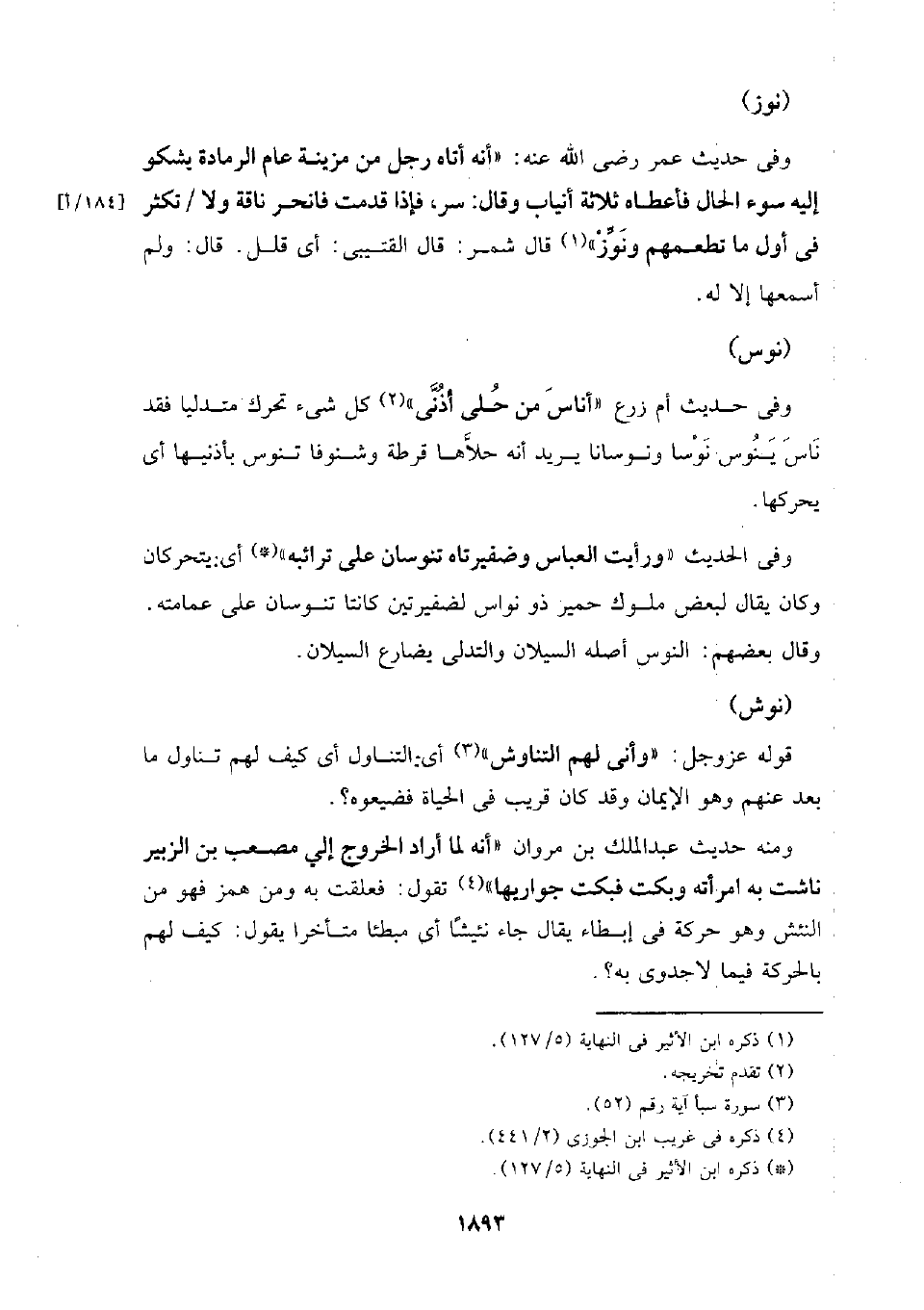 وفي الحديث (ورأيت العباس وضفيرتاه تنوسان على ترائبه) أي: يتحركا وكان يقال لبعض ملوك حمير ذو نواس لضفيرتين كانتا تنوسان على عمامته وقال بعضهم: النوس أصله السيلان والتدلي يضارع السيلان.