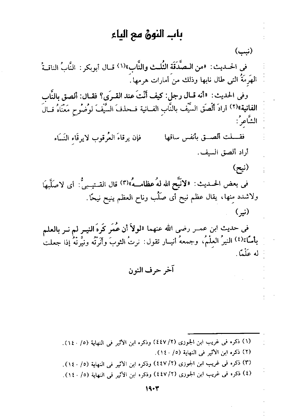 في الحديث: (من الصدقة الثلث والناب) قال أبو بكر: الناب الناقة الهرمة التي طال نابها وذلك من أمارات هرمها.