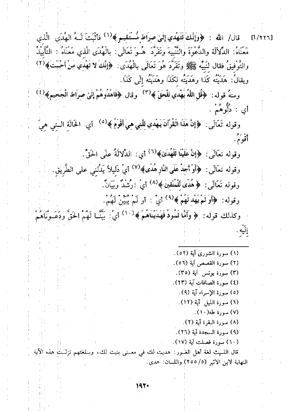 قال الله: {وإنك لتهدي إلى صراط مستقيم} فأثبت له الهدى الذي معناه: الدلالة والدعوة والتنبيه وتفرد هو تعالى: بالهدى الذي معناه: التأييد والتوفيق فقال لتبيه - صلى الله عليه وسلم - وتفرد هو تعالى بالهدى: {إنك لا تهدي من أحببت} ويقال: هديته كذا وهديته لكذا وهديته إلى كذا.