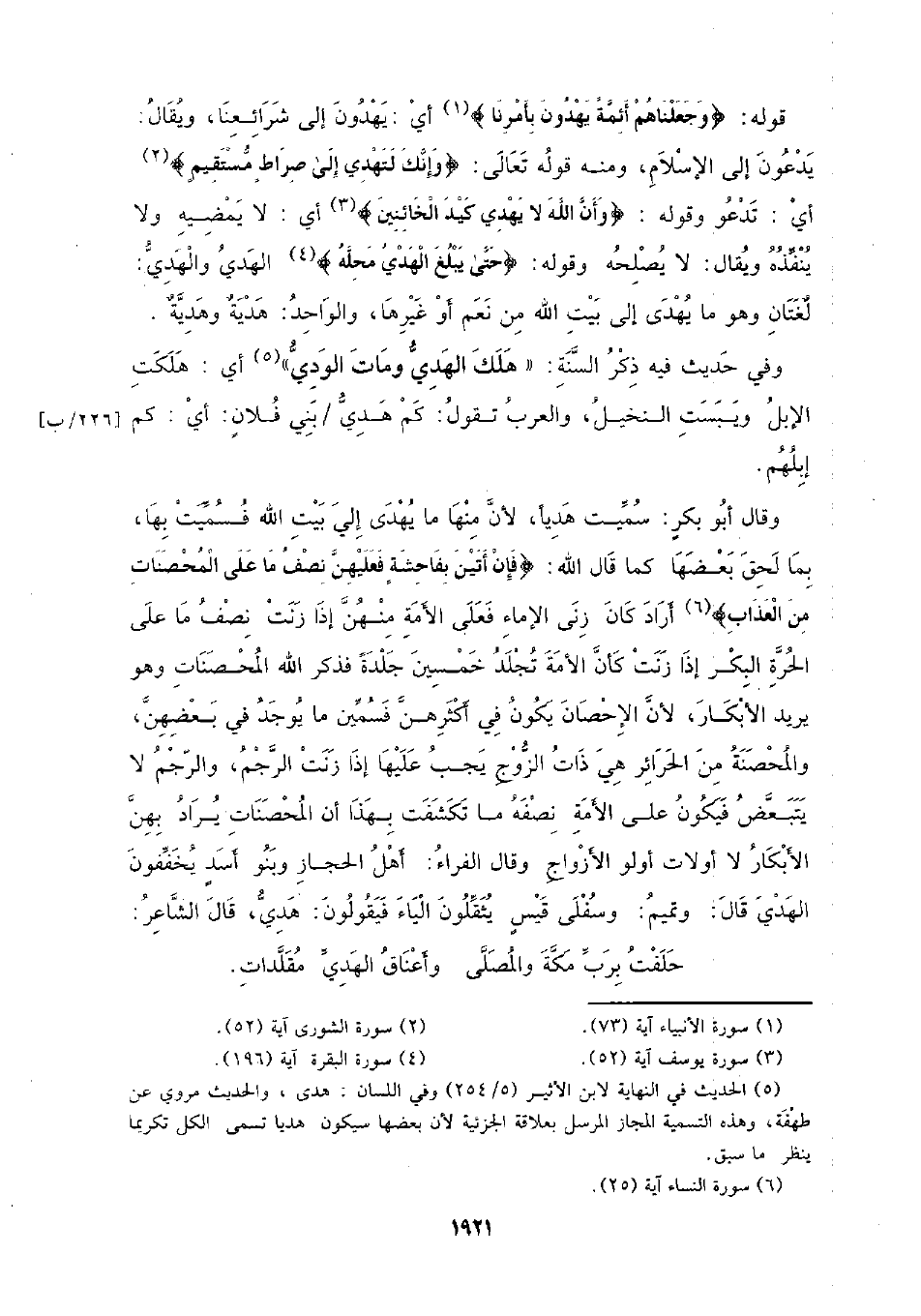 وقال أبو بكر: سميت هديا، لأن منها ما يهدي إلى بيت الله فسميت بها، بما لحق بعضها كما قال: {فإن أتين بفاحشة فعليهن نصف ما على المحصنات من العذاب} أراد كان زنى الإماء فعلى الأمة منهن إذا زنت نصف ما عىل الحرة البكر إذا زنت كأن الأمة تجلد خمسين جلدة فذكر الله المحصنات وهو يريد الأبكار، لأن الإحصان يكون في أكثرهن فسمين ما يوجد في بعضهن، والمحصنة من الحرائر هي ذات الزوج يجب عليها إذا زنت الرجم، والرجم لا يتبعض فيكون على الأمة نصفه ما تكشف بهذا أن المحصنات يراد بهن الأبكار لو أولات أولو الأزواج وقال الفراء: أهل الحجاز وبنو أسد يخففون الهدي قال: وتميم: وسفلى قيس يثقلون الياء فيقولون: هدي، قال الشاعر: