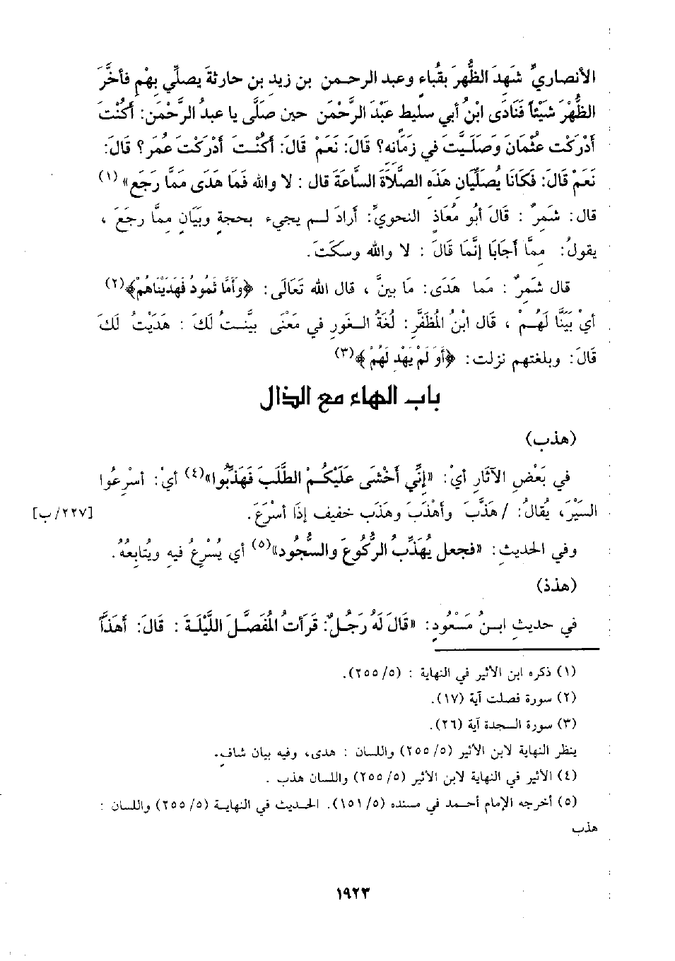 الأنصاري شهد الظهر بقباء وعبد الرحمن بن زيد بن حارثة يصلي بهم فأخر الظهر شيئًا فنادى ابن أبي سليط عبد الرحمن حين صلى يا عبد الرحمن: أكنت أدركت عثمان وصليت في زمانه؟ قال: نعم قال: أكنت أدركت عمر؟ قال: نعم قال: فكانا يصليان هذه الصلاة الساعة قال: لا والله فما هدى مما رجع) قال: شمر: قال أبو معاذ النحوي: أراد لم يجئ بحجة وبيان مما رجع، يقول: مما أجابا إنما قال: لا والله وسكت.