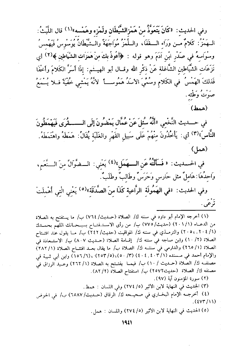 وفي الحديث: (كان يتعوذ من همز الشيطان ولمزه وهمسه) قال الليث: الهمز: كلام من وراء القفا , واللمز مواجهه والشيطان يوسوس فيهمس وسواسه فى صدر ابن ادم وهو قوله: {اعوذ بك من همزات الشيطان} أى نزعات الشيطان الشاغله عن ذكر الله وقال ابو الهيثم: اذا اسر الكلام واخفا فذلك الهمس فى الكلام وسمى الاسد هموسا لانه يمشى خفيه فلا يسمع صوت وطئه.