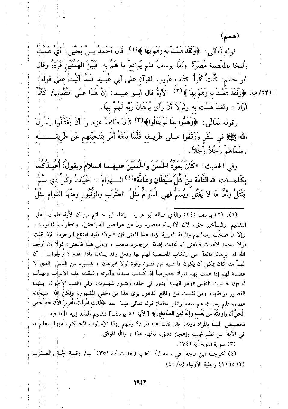 قوله تعالى: {ولقد همت به وهم بها} قال أحمد بن يحيى: أي همت زليخا بالعمصية مصرة أما يوسف فلم يواقع ما هم به فبين الهمتين فرق وقال أبو حاتم: كنت اقرأ كتاب غريب القرآن علي أبي عبيد فلما أتيت على قوله: {ولقد همت به وهم بها} الآية قال أبو عبيد: إن هذا على التقديم كأنه أراد: ولقد همت به ولولا أن رأى برهان ربه لهم بها.