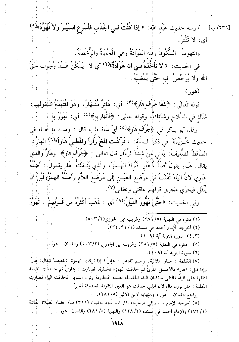 وقال أبو بكر في} جرف هار} أي: ساقط، قال: ومنه جاء في حديث خزيمة في ذكر السنة: (تركت المخ رارًا والمطي هارًا) الهار: الساقط الضعيف: يعني من شدة الزمان قال تعالى: {جرف هار} وهار والذي يقال: هار يقول أصله هار فترك الهمز، والذي ينفك هار يقول: أصله هاري لأن الياء تقلب في موضع العين إلى موضع اللام وأصله الهمز وقبل أن ينقل فيجري مجرى قولهم عاقني وقعاني.