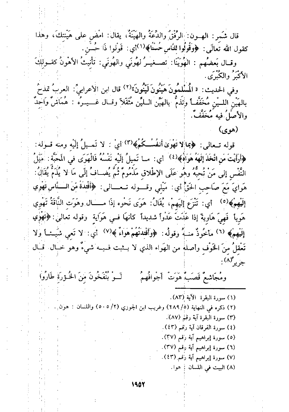 قوله تعالى"} بما لا تهوى أنفسكم} أي: لا تميل إليه ومنه قوله: {أرأيت من اتخذ إلهه هواه} أي: ما تميل إليه نفسه فالهوى في المحبة: ميل النفس إلى من تحبه وهو على الإطلاق مذموم ثم يضاف إلى ما لا يذم يقال: هواي مع صاحب الحق أي: ميلي وقوله تعالى: {أفئدة من الناس تهوي إليهم} أي: تنزع إليهم، يقال: هوى نحوه إذا مال وهوت الناقة تهوي هويا فهي إذا عدت عدوا شديدا كأنها في هواية وقوله تعالى: {تهوي إليهم} مأخوذ منه وقوله: {وأفئدتهم هواء} أي: لا تعي شيئا ولا تعقل من الخوف وأصله من الهواء الذي لا يثبت فيه شيء وهو خال قال جرير: