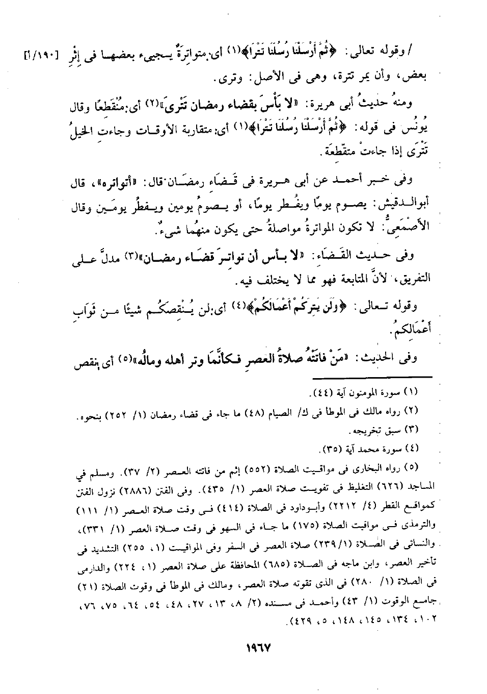 ومنه حديث أبي هريرة: (لا بأس بقضاء رمضان تترى) أي: منقطعا وقال يونس في قوله: {ثم أرسلنا رسلنا تترا} أي: متقاربة الأوقات وجاءت الخيل تترى إذا جاءت متقطعة.