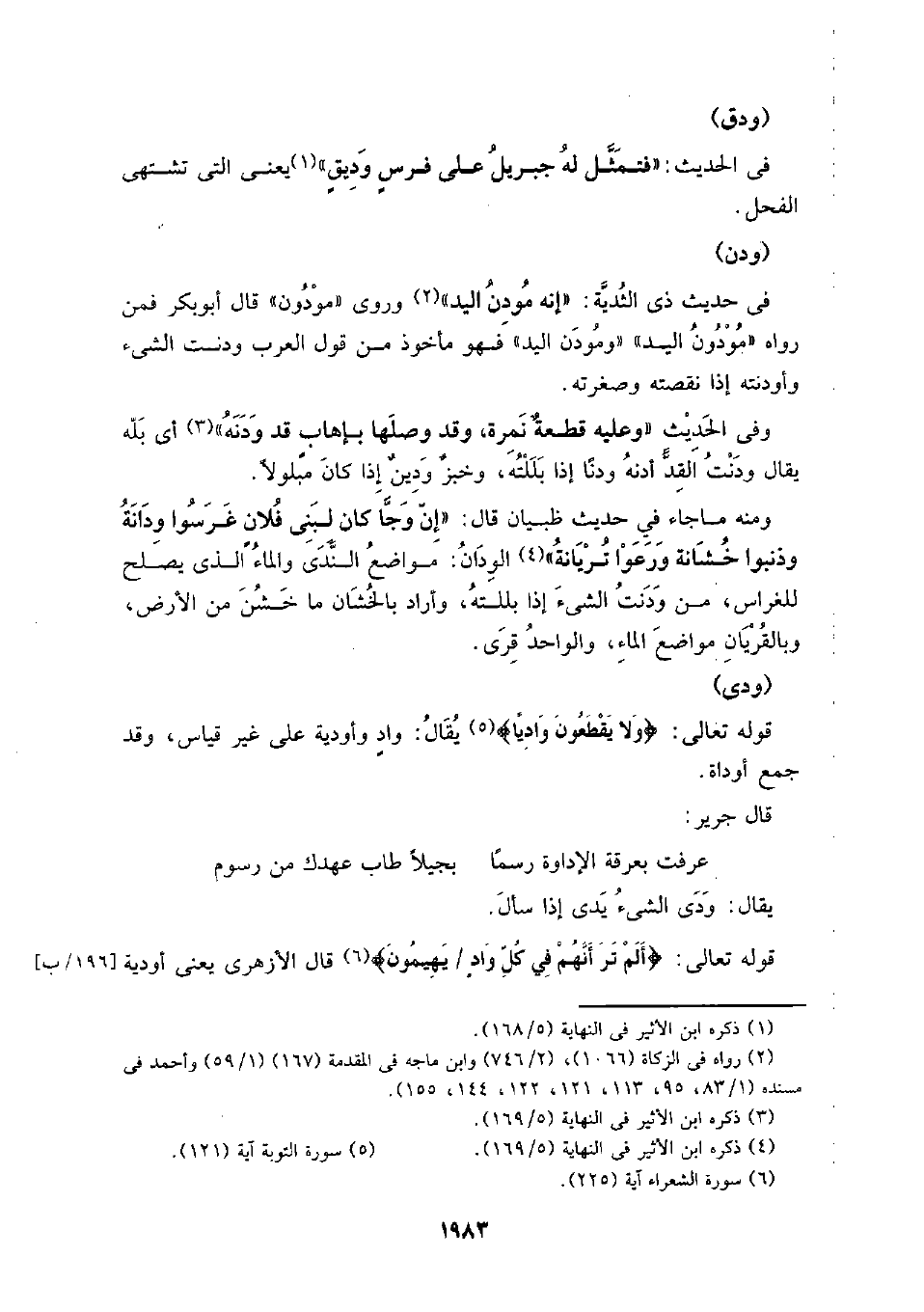ومنه ما جاء في حديث ظبيان قال: (إن وجا كان لبني فلان غرسوا ودانة وذنبوا خشانة ورعوا تريانة) الودان: مواضع الندى والماء الذي يصلح للغراس، من ودنت الشيء إذا بللته، وأراد بالخشان ما خشن من الأرض، وبالقريان مواضع الماء، والواحد قرى.