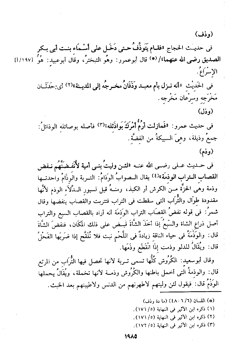 في حديث علي رضي الله عنه (لئن وليت بني أمية لأنفضنهم نفض القصاب التراب الوذمة) يقال الصواب الوذام: التربة والوذام واحدتها وذمة وهي الحزة من الكرش أو الكبد، ومنه قيل لسيور الدلاء الوذم لأنها مقدودة طوال والتراب التي سقطت في التراب فتتربت والقصاب ينفضها وقال شمر: في قوله نفض القصاب التراب الوذمة أنه أراد بالقصاب السبع والتراب أصل ذراع الشاة والسبع إذا أخذ الشاة قبض على ذلك المكان، فنفض الشاة قال: والوذمة في حياء الناقة زيادة في اللحم نبت فلا تلقح إذا ضربها الفحل قال: ويقال للدلو وذمت إذا انقطع وذمها.