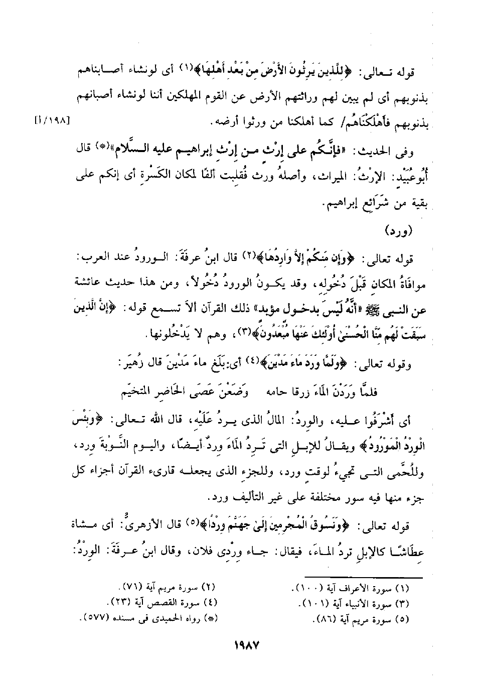 قوله تعالى: {وإن منكم إلا واردها} قال ابن عرفة: الورود عند العرب: موافاة المكان قبل دخوله، وقد يكون الورود دخولا، ومن هذا حديث عائشة عن النبي - صلى الله عليه وسلم - (أنه ليس بدخول مؤبد) ذلك القرآن ألا تسمع قوله: {إن الذين سبقت لهم منا الحسنى أولئك عنها مبعدون}، وهم لا يدخلونها.