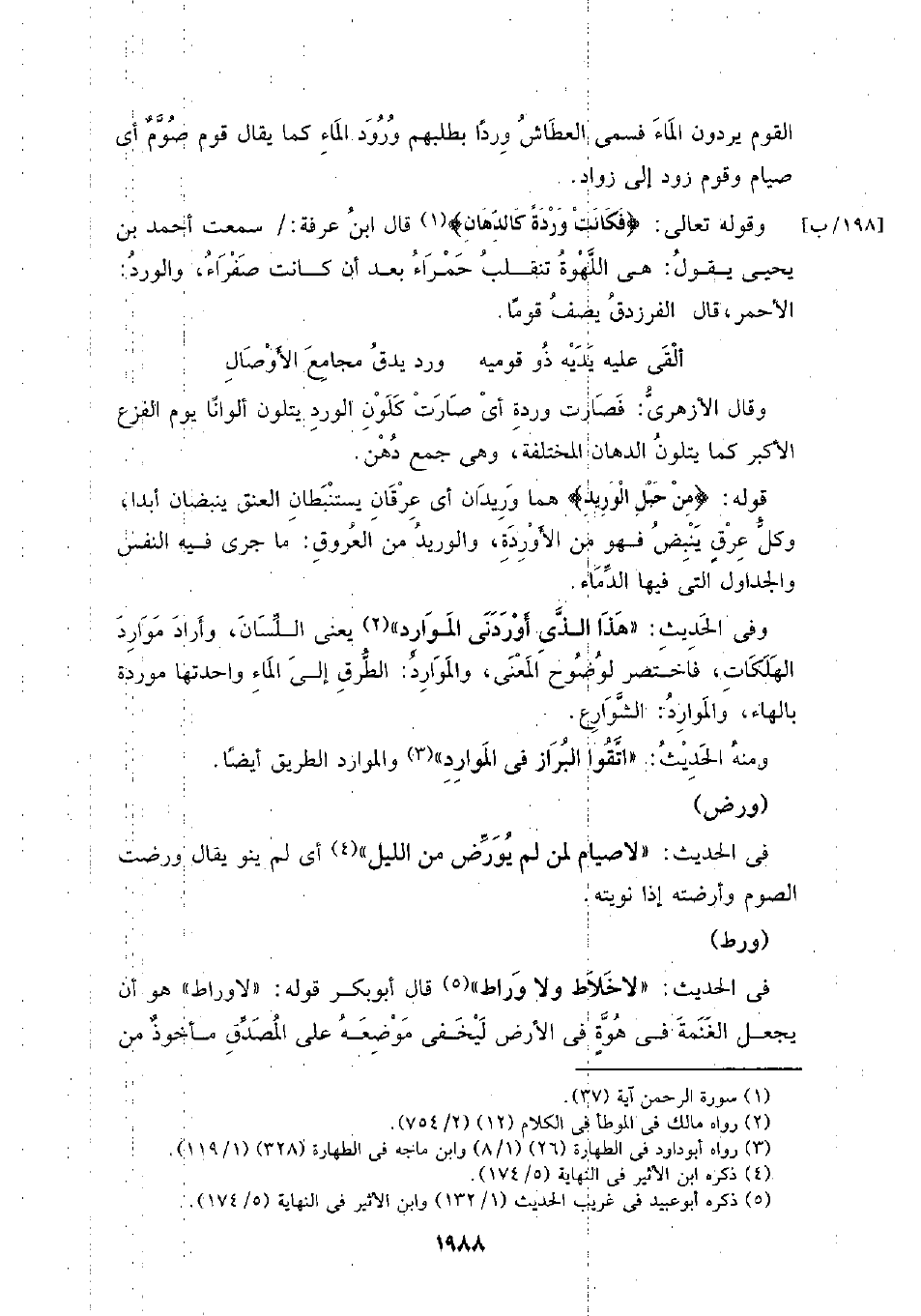 وفي الحديث: (هذا الذي أوردني الموارد) يعني اللسان، وأراد موارد الهلكات، فاختصر لوضوح المعنى، والموارد: الطرق إلى الماء واحدتها موردة بالهاء، والموارد: الشوارع.