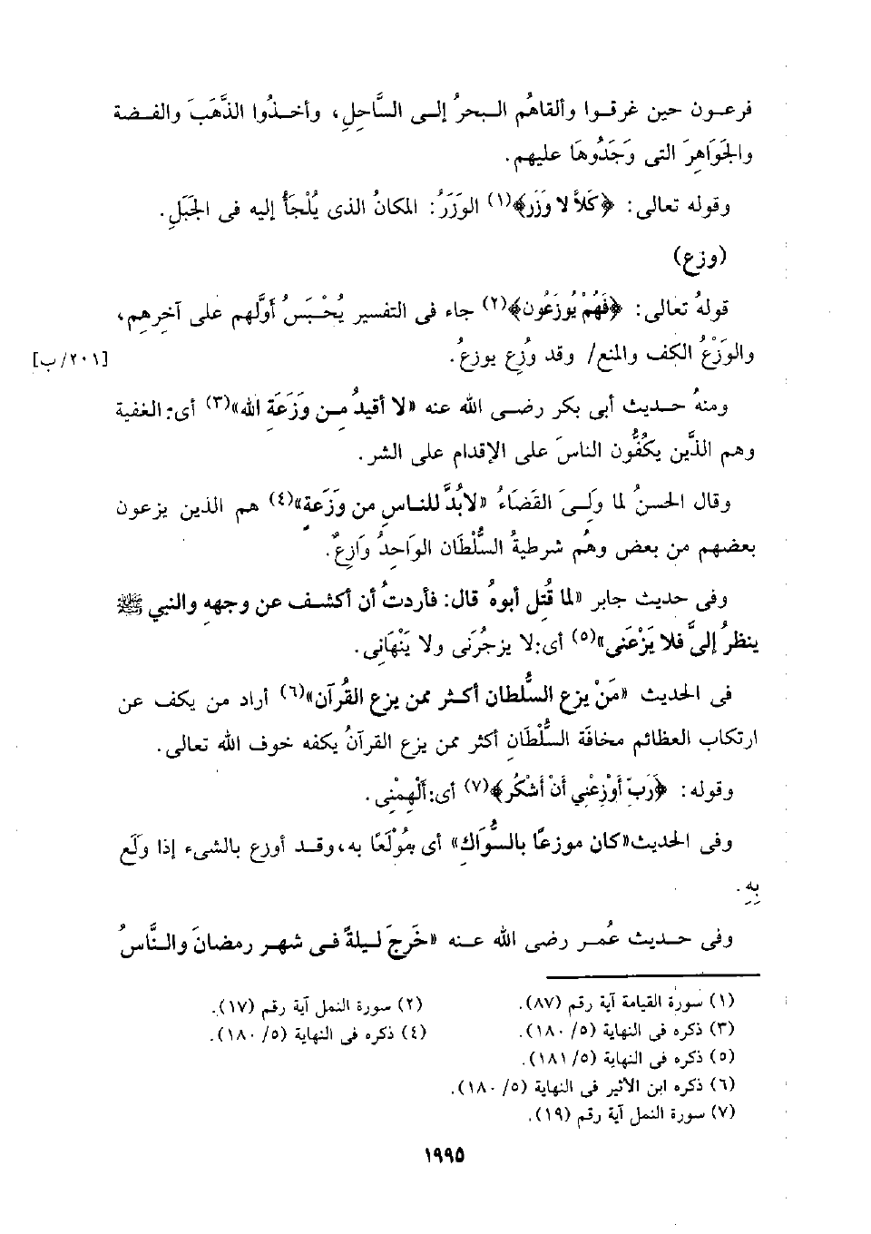 ومنه حديث أبي بكر رضي الله عنه (لا أقيد من وزعة الله) أي: الغفية وهم الذين يكفون الناس على الإقدام على الشر.