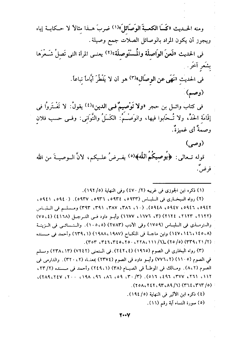 ومنه الحديث (كسا الكعبة الوصائل) ضرب هذا مثالاُ لا حكاية إياه ويجوز أن يكون المراد بالوصائل الصلات جمع وصيلة.