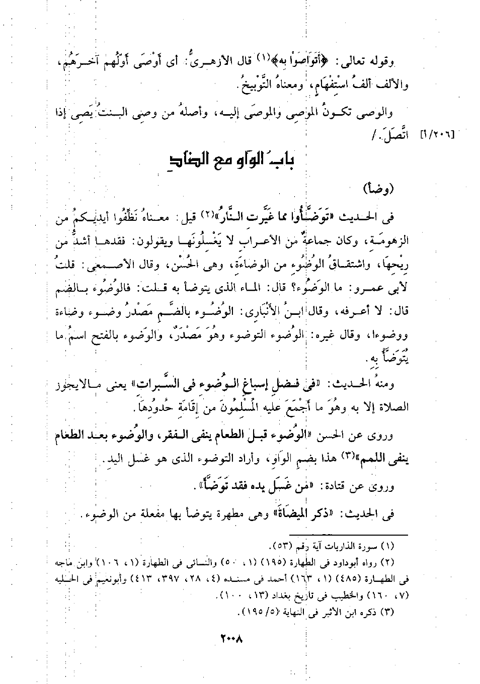 في الحديث (توضأوا مما غيرت النار) قيل: معناه نظفوا أيديكم من الزهومة، وكان جماعة من الأعراب لا يغسلونها ويقولون: فقدها أشد من ريحها، واشتقاق الضوء من الوضاءة، وهي الحسن، وقال الأصمعي: قلت لأبي عمرو: ما الوضوء؟ الوضوء بالضم مصدر وضوء وضاءة ووضوءا، وقال غيره: الوضوء التوضؤ وهو مصدر، والوضوء بالفتح اسم من يتوضأ به.