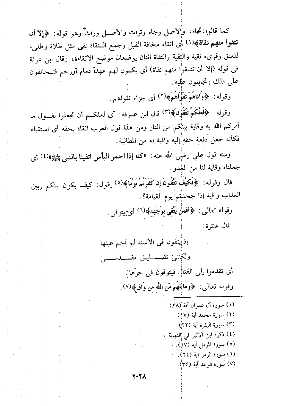 كما قالوا: تجاه، والأصل وجاه وتراث والأصل وراث وهو قوله: {إلا أن تتقوا منهم تقاة} أي اتقاء مخالفة القيل وجمع التقاة تقي مثل طلاة وطلئ للعتق وقرئ تقية والتقية والتقاة اثنان يوضعان موضع الاتقاءة، وقال ابن عرفة في قوله (إلا أن تتقوا منهم تقاة) أي يكون لهم عهدًا ذمام أو رحم فتحالفون على ذلك وتجابلون عليه.