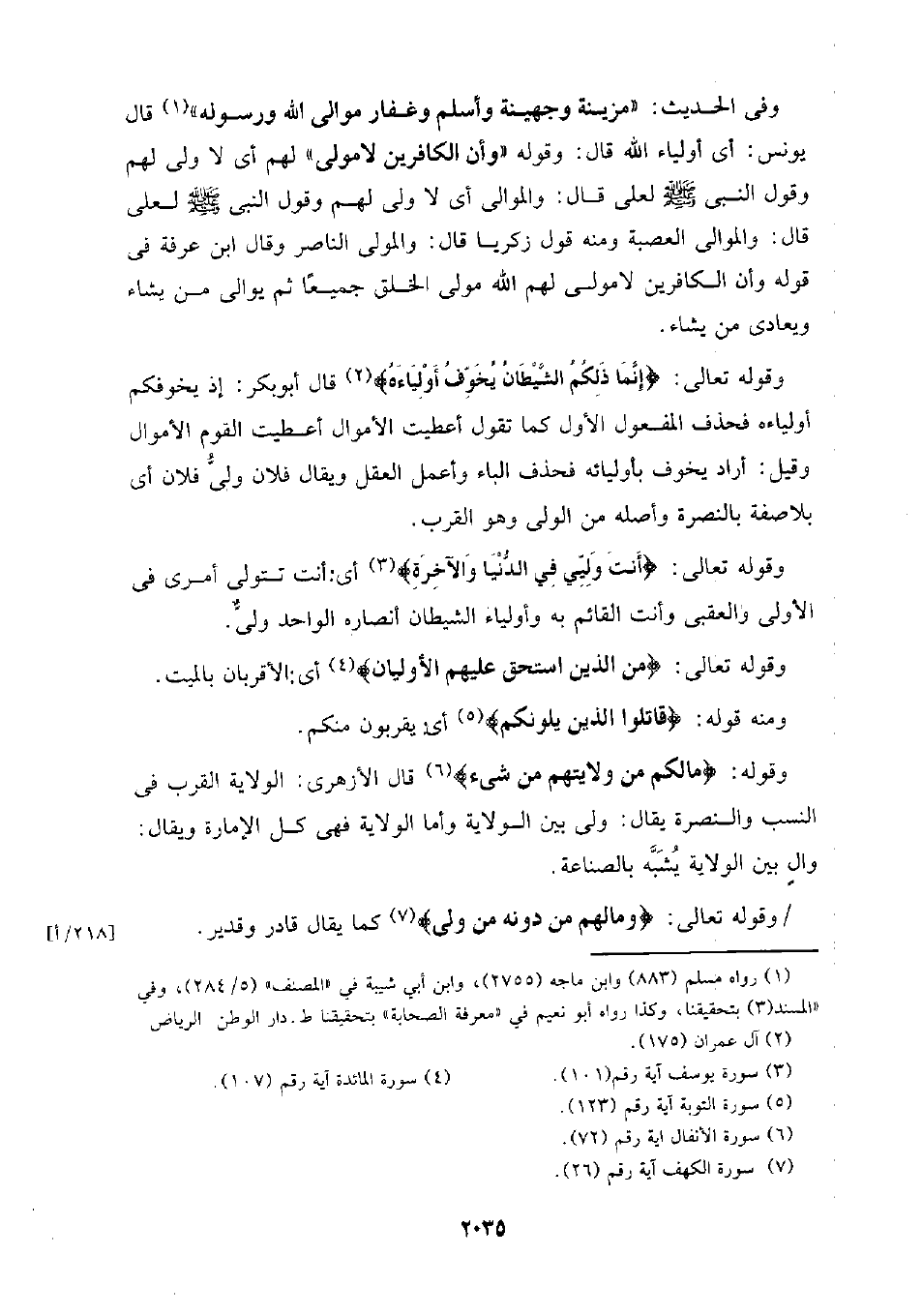 وفي الحديث: (مزينة وجهينة وأسلم وغفار موالي الله ورسوله قال يونس أي أولياء الله قال: وقوله (وان الكافرين لا مولى) لهم أي لا ولي لهم وقول النبي - صلى الله عليه وسلم - لعلي قال: والموالي أي لا ولي لهم وقول النبي - صلى الله عليه وسلم - لعلي قال: والموالي العصبة ومنه قول زكريا قال: والمولى الناصر وقال ابن عرفة في قوله وأن الكافرين لا مولى لهم الله مولى الخلق جميعا ثم يوالي من يشاء ويعادي من يشاء.