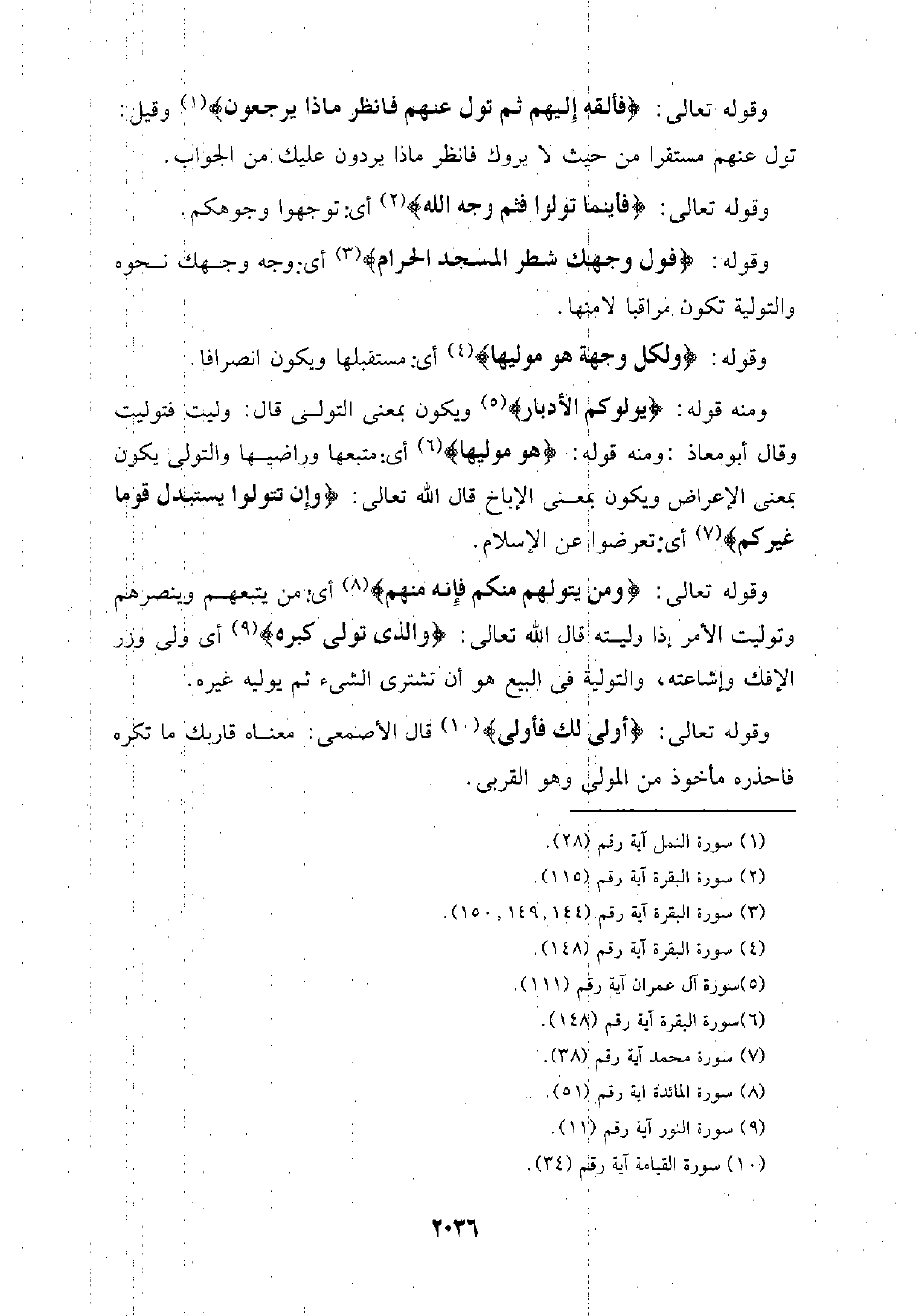 ومنه قوله: {يولوكم الأدبار} ويكون بمعنى التولي قال: وليت فتوليت وقال أبو معاذ: ومنه قوله: {هو موليها} أي: متبعها وراضيها والتولي يكون بمعنى الإعراض ويكون بمعنى الإباخ قال الله تعالى: {وإن تتولوا يستبدل قومًا غيركم} أي: تعرضوا عن الإسلام.