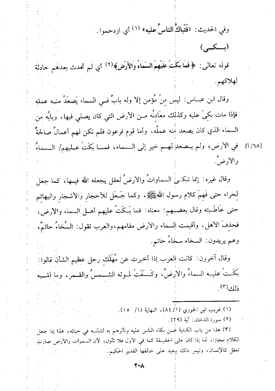 وقال غيره: إنما تبكى السماوات والأرض لعقل يجعله الله فيها، كما جعل لحراء حتى فهم كلام رسول الله - صلى الله عليه وسلم -، وكما جعل للأحجار والأشجار والبهائم حتى خاطبته وقال بعضهم: معناه: فما بكت عليهم أهل السماء والأرض، فحذف الأهل، وأقيمت السماء والأرض مقامهم، والعرب تقول: السخاء حاتم، وهم يريدون: السخاء سخاء حاتم.