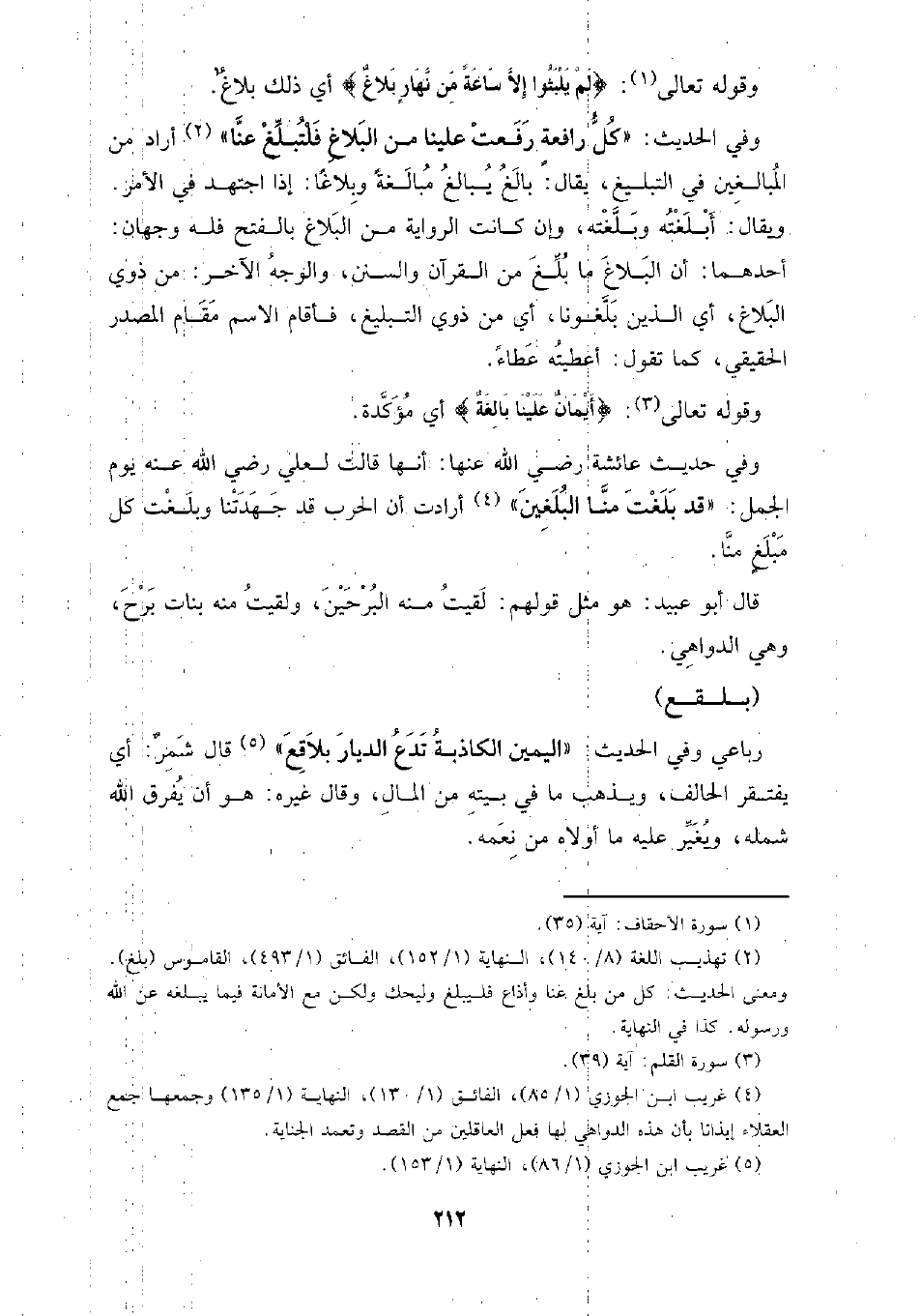 وفي الحديث: (كل رافعة رفعت علينا من البلاغ فلتبلغ عنا) أراد من المبالغين في التبليغ، يقال: بالغ يبالغ مبالغة وبلاغًا: إذا اجتهد في الأمر. ويقال: أبلغته وبلغته، وإن كانت الرواية من البلاغ بالفتح فله وجهان: أحدهما: أن البلاغ ما بلغ من القرآن والسنن، والوجه الآخر: من ذوي البلاغ، أي الذبن بلغونا، أي من ذوي التبليغ، فأقام الاسم مقام المصدر الحقيقي، كما تقول: أعطيته عطاءٌ.