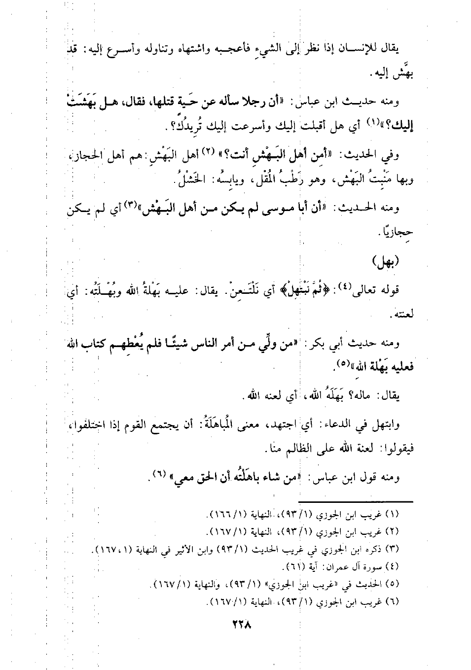 ومنه حديث ابن عباس: (أن رجلا سأله عن حية قتلها، فقال، هل بهشت إليك؟ ) أي هل أقبلت إليك وأسرعت إليك تريدك؟