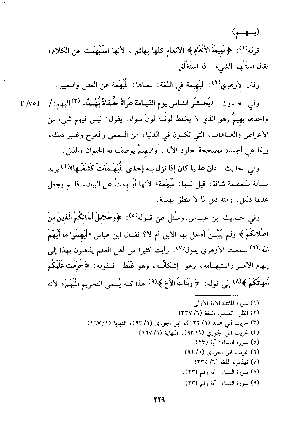 وفي الحديث: (أن عليا كان إذا نزل به إحدى المبهمات كشفها) يريد مسألة معضلة شاقة، قيل لها: مبهمة؛ لأنها أبهمت عن البيان، فلم يجعل عليها دليل. ومنه قيل لما لا ينطق بهيمة.