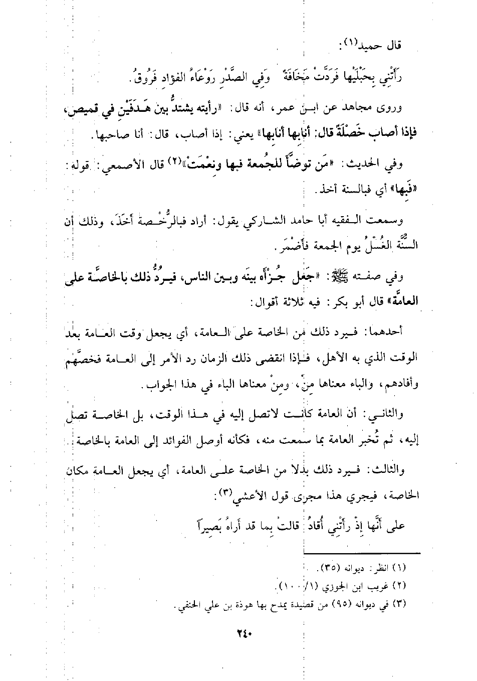 وفي صفته - صلى الله عليه وسلم -: (جعل جزأه بينه وبين الناس، فيرد ذلك بالخاصة على العامة) قال أبو بكر: فيه ثلاثة أقوال: