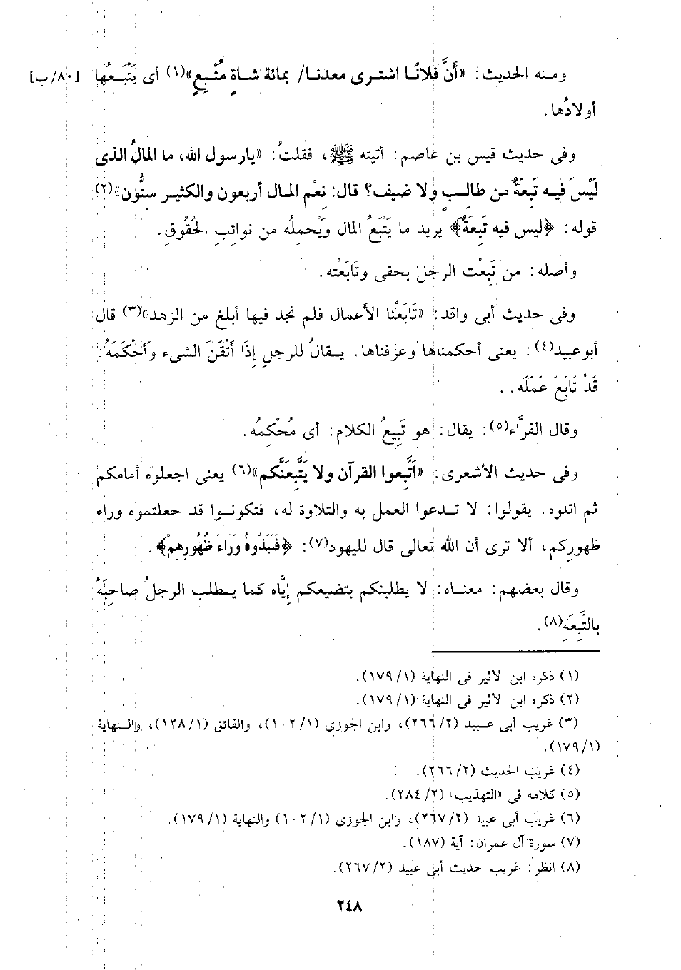 وفي حديث قيس بن عاصم: أتيته - صلى الله عليه وسلم -، فقلت: (يا رسول الله، ما المال الذي ليس فيه تبعة من طالب ولا ضيف؟ قال: نعم المال أربعون والكثير ستون) قوله: {ليس فيه تبعة} يريد ما يتبع المال ويحمله من نوائب الحقوق.