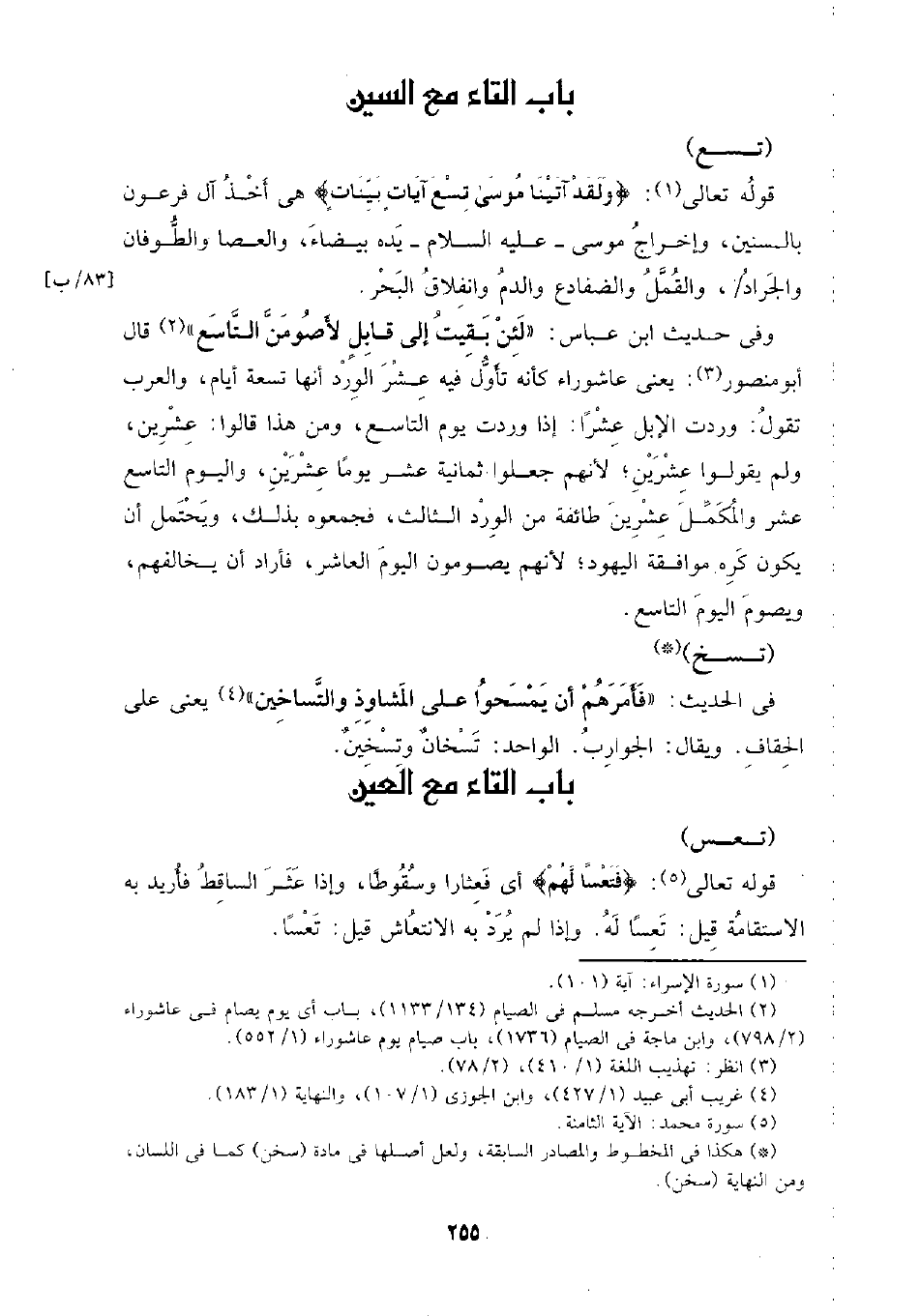 وفي حديث ابن عباس: (لئن بقيت إلى قابل لأصومن التاسع) قال أبو منصور: يعني عاشوراء كأنه تأول فيه عشر الورد أنها تسعة أيام، والعرب تقول: وردت الإبل عشرًا: إذا وردت يوم التاسع، ومن هذا قالوا: عشرين، ولم يقولوا عشرين؛ لأنهم جعلوا ثمانية عشر يومًا عشرين، واليوم التاسع عشر والمكمل عشرين طائفة من الورد الثالث، فجمعوه بذلك، ويحتمل أن يكون كره موافقة اليهود؛ لأنهم يصومون اليوم العاشر، فأراد أن يخالفهم، ويصوم اليوم التاسع.