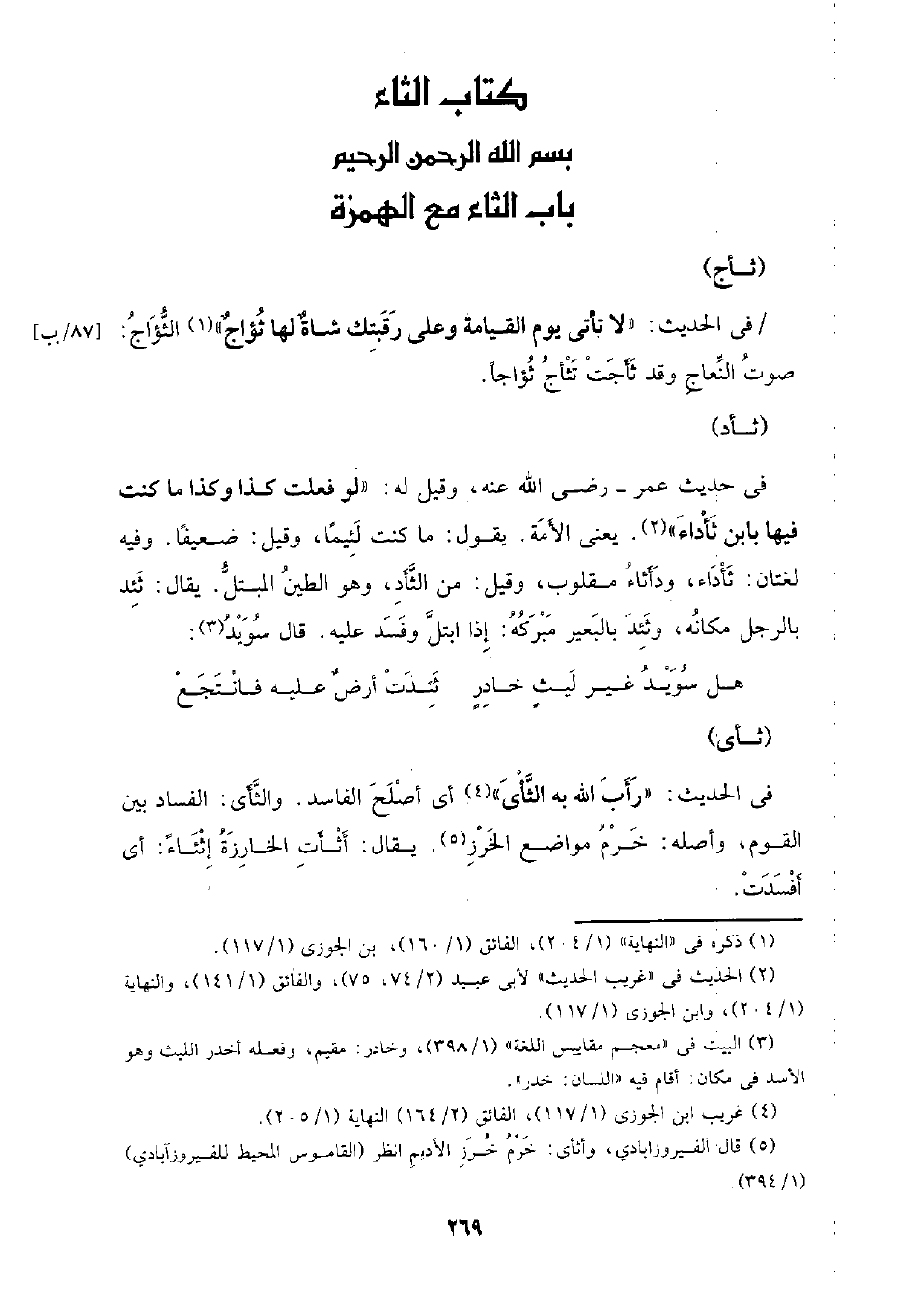 / في الحديث: (لا تأتي يوم القيامة وعلى رقبتك شاة لها ثؤاج) الثؤاج: صوت النعاج وقد ثأجت تثأج ثؤاجًا.