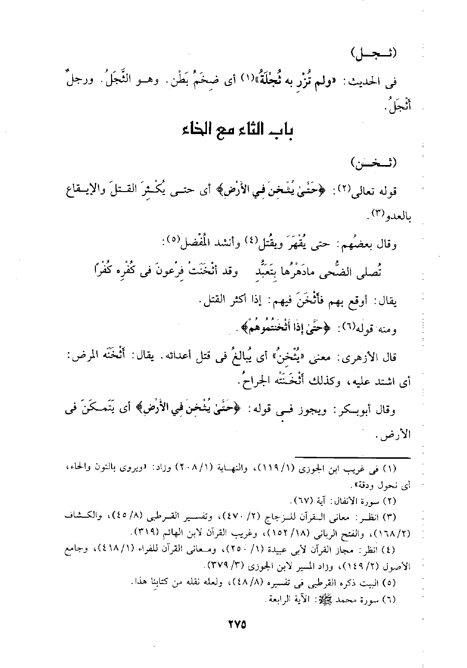 قال الأزهري: معنى (يثخن) أي يبالغ في قتل أعدائه. يقال: أثخنه المرض: أي اشتد عليه، وكذلك أثخنته الجراح.