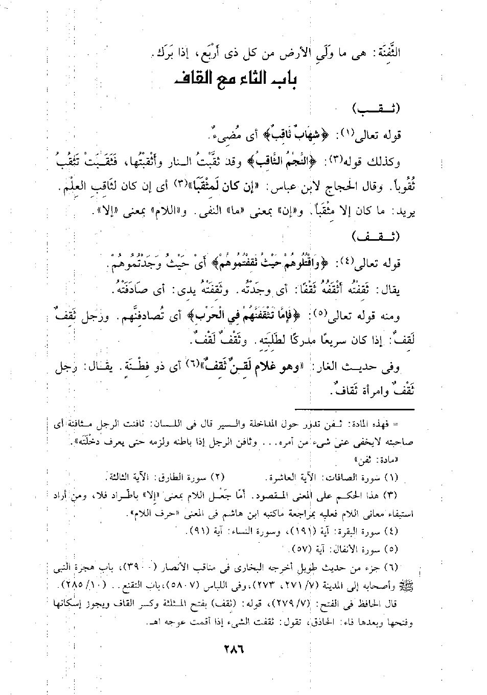 وكذلك قوله: {النجم الثاقب} وقد ثقبت النار وأثقبتها، فثقبت تثقب ثقوبًا. وقال الحجاج لابن عباس: (إن كان لمثقبا) أي إن كان لثاقب العلم. يريد: ما كان إلا مثقبًا. و (إن) بمعنى (ما) النفي. و (اللام) بمعنى (إلا).