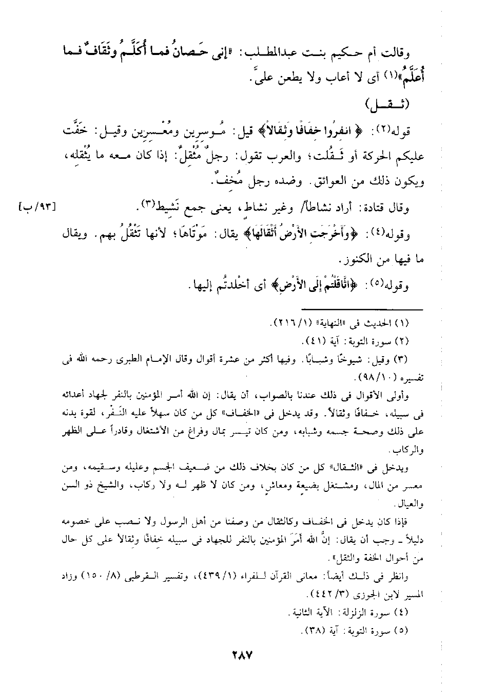 قوله: {انفروا خفافًا وثقالًا} قيل: موسرين ومعسرين وقيل: خفت عليكم الحركة أو ثقلت؛ والعرب تقول: رجل مثقل: إذا كان معه ما يثقله، ويكون ذلك من العوائق. وضده رجل مخف.