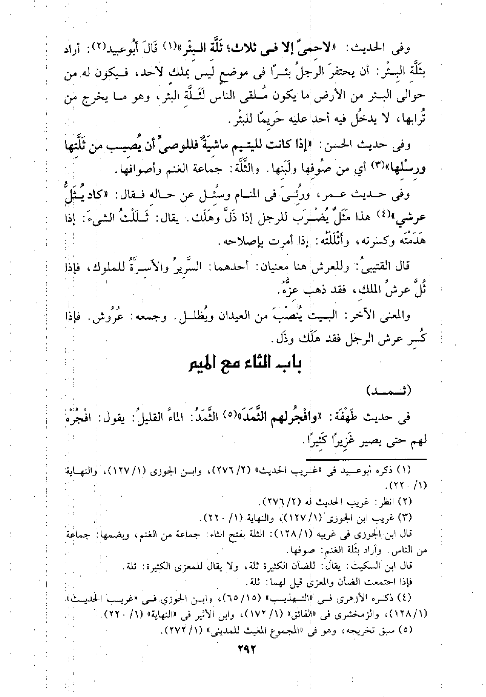 وفي الحديث: (لا حمى إلا في ثلاث؛ ثلة البئر) قال أبو عبيد: أراد بثلة البئر: أن يحتفر الرجل بئرًا في موضع ليس بملك لأحد، فيكون له من حوالي البئر من الأرض ما يكون ملقى الناس لثلة البئر، وهو ما يخرج من ترابها، لا يدخل فيه أحد عليه حريمًا للبئر.