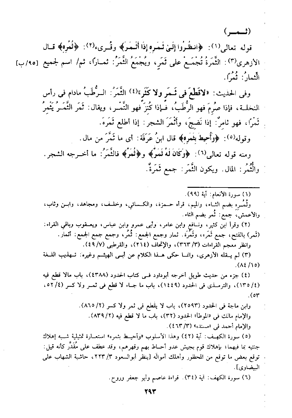 ومنه قوله تعالى: {وكان له ثمر} و} ثمر} فالثمر: ما أخرجه الشجر. والثمر: المال. ويكون الثمر: جمع ثمرة.