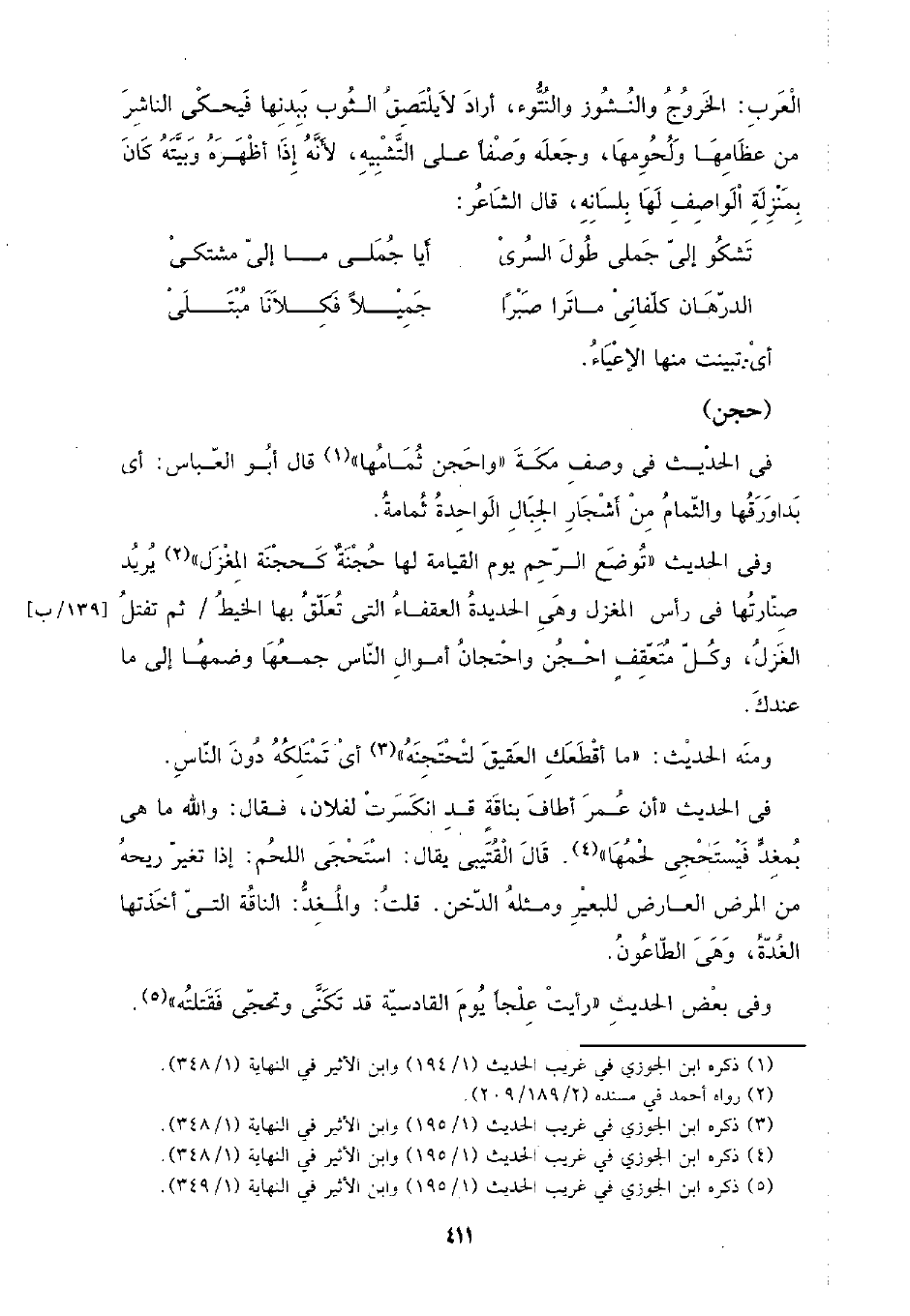 وفي الحديث (توضع الرحم يوم القيامة لها حجنة كحجنة المغزل) يريد صنارتها في رأس المغزل وهي الحديدة العقفاء التي تعلق بها الخيط/ ثم تفتل [139/ب] الغزل، وكل متعقف أحجن واحتجان أموال الناس جمعها وضمها إلى ما عندك.