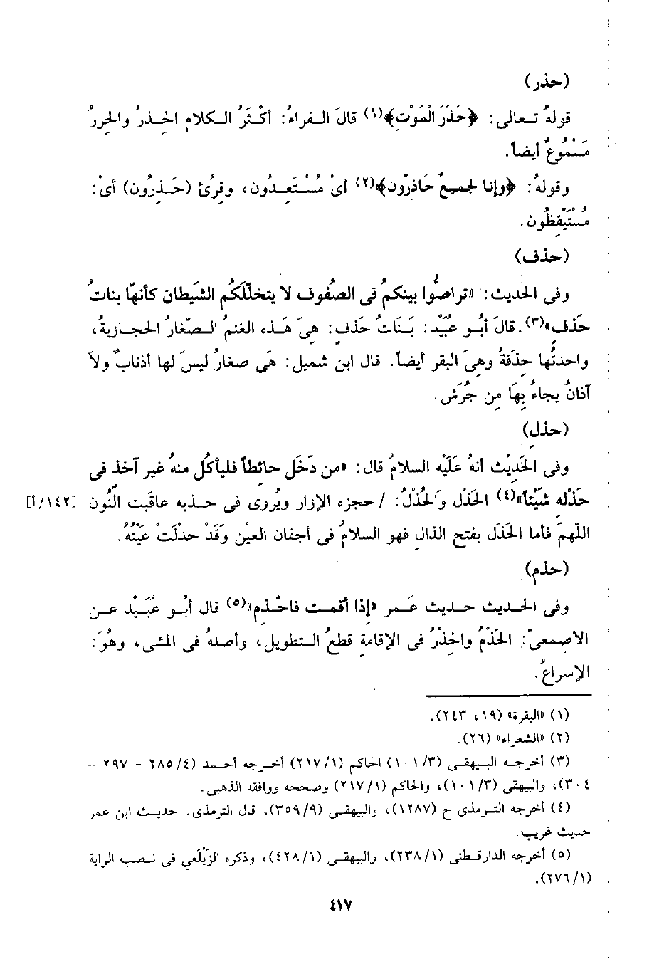 وفي الحديث حديث عمر (إذا أقمت فاحذم) قال أبو عبيد عن الأصمعي: الحذم والحذر في الإقامة قطع التطويل، وأصله في المشي، وهو: الإسراع.